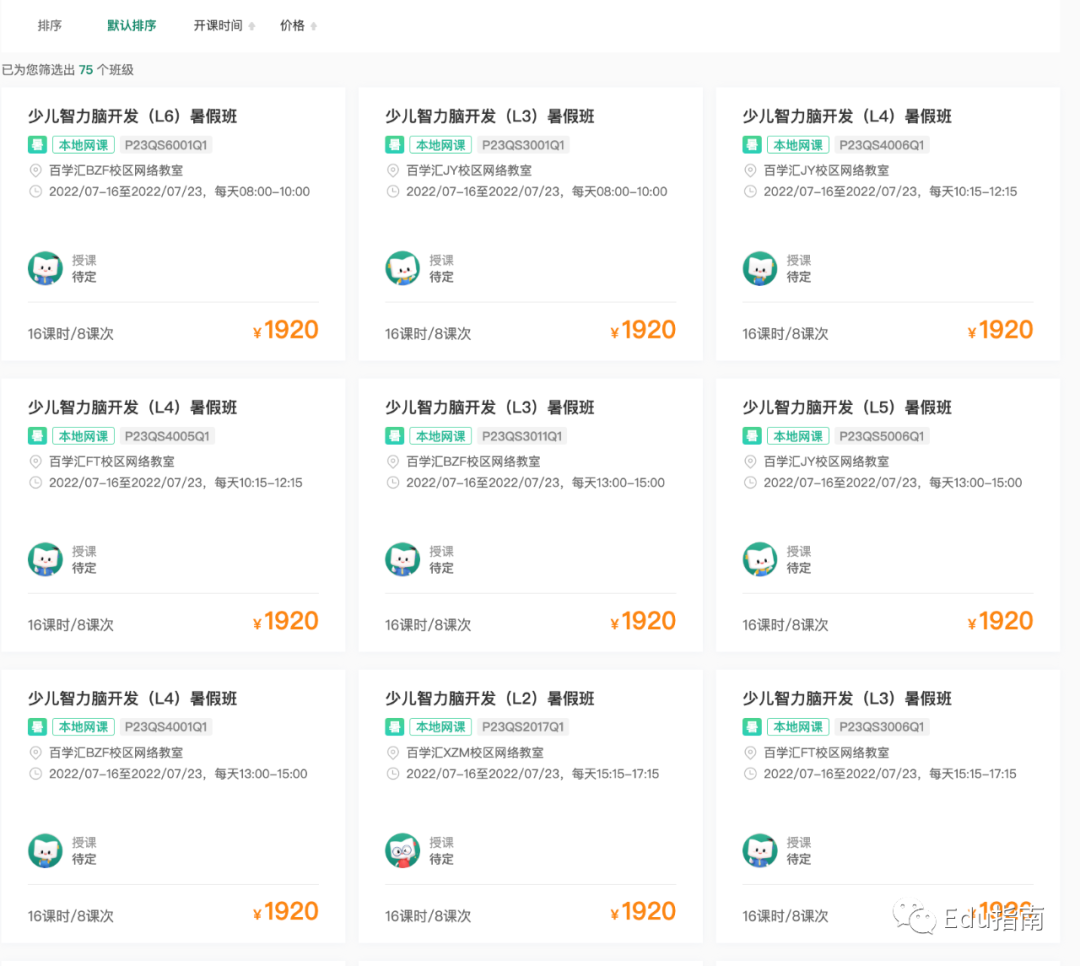 少年智力脑开发,同样是16课时暑假班在线教学,定价为1920元,平均课时费为120元。