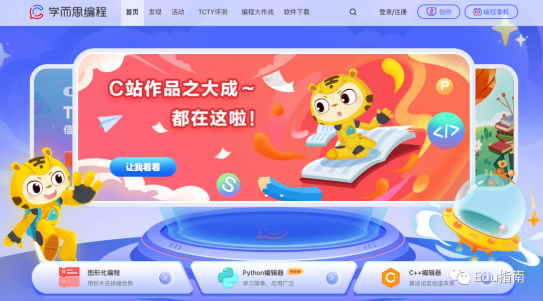 编程社区支持儿童学生用户,进行图形化编程、使用Python编辑器、C++编辑器。此外还有编程作品、活动、评测等。