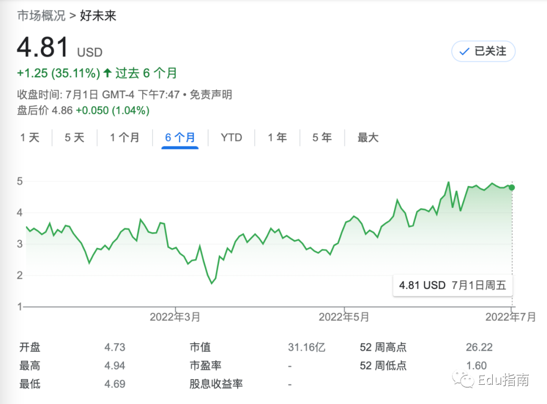 好未来公司过去半年市值上升35.1%,当前市值为31.2亿美元。
