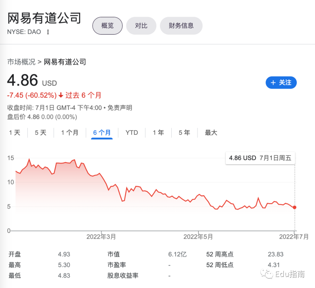 二级市场方面,与新东方、好未来公司过去半年市值上升表现不同,有道公司过去半年下跌60.5%,当前市值为6.1亿美元。