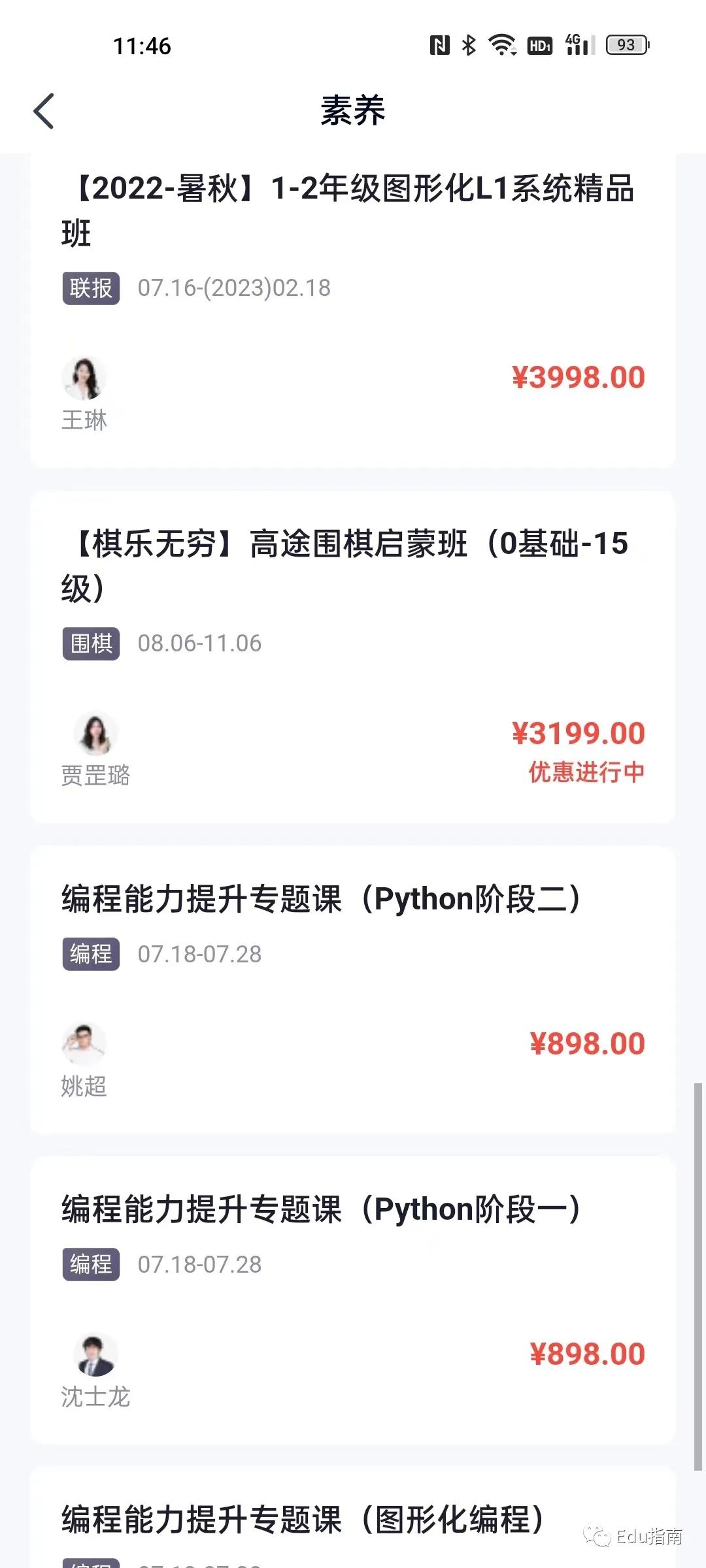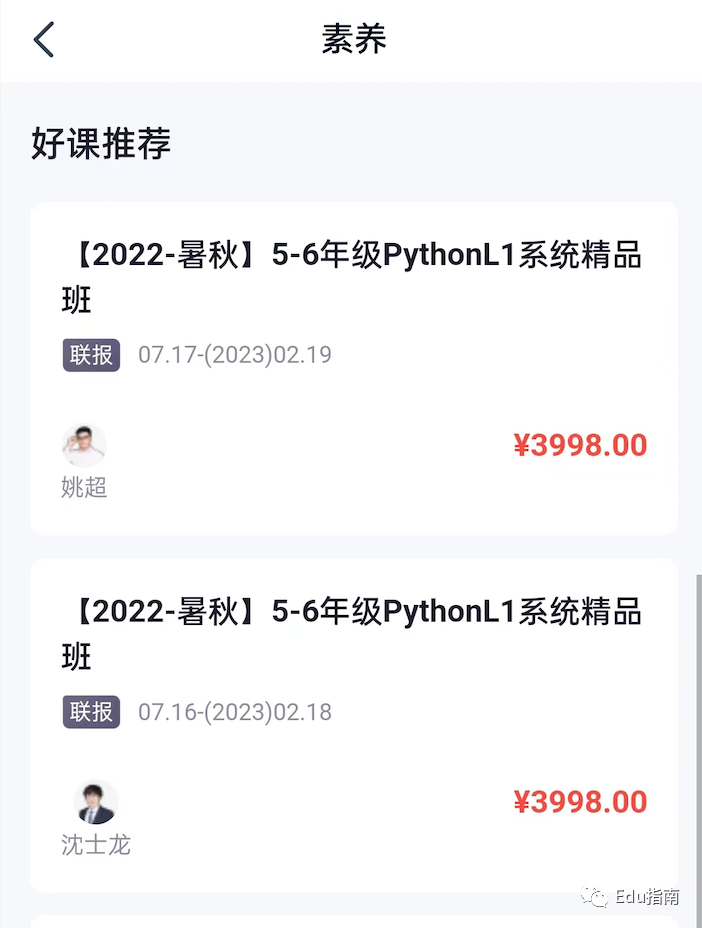 当前高途推出的素养课程包括棋艺、编程、科学、脑力、悦读、演讲与口才等。付费课程定价在数百元至数千元不等。例如编程类课程面向5-6年级学生用户的Python系统精品班,定价为3998元,学习时间跨度数月。而教学时间较短的专题课程例如“编程能力提升课”,定价为898元教学时长约为10天。