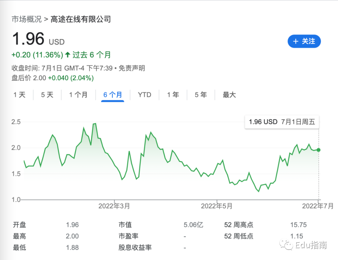 高途公司过去半年市值上升11.4%,当前市值为5.1亿美元。