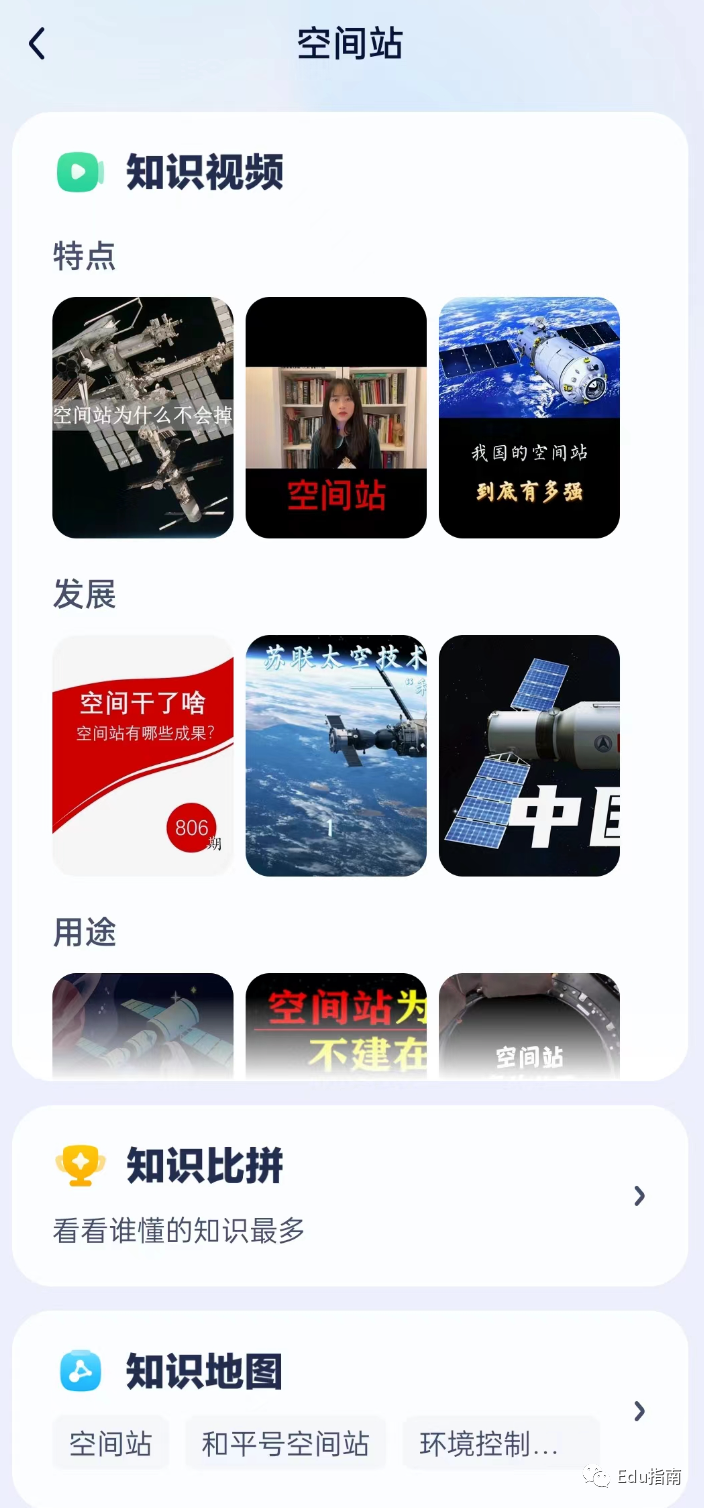 例如进入“宇宙探秘”空间站知识,可以看到包括特点、发展、用途等讲解视频: