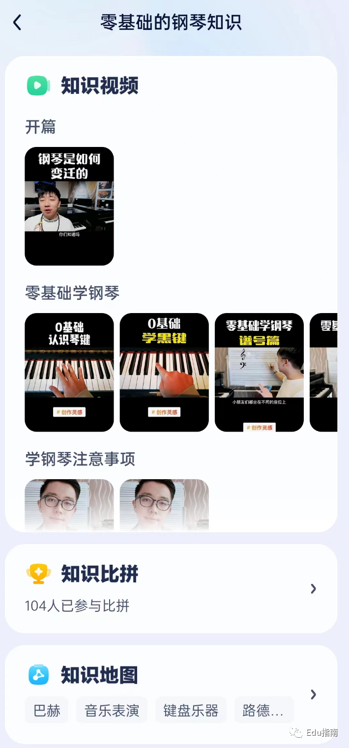 进入“艺术兴趣”钢琴知识,则可以看到该领域变迁、零基础教程等: