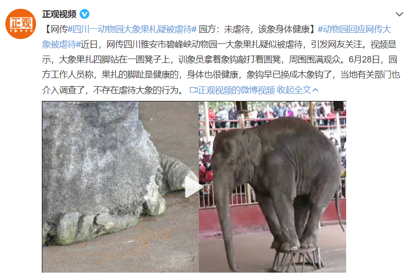 就在不久前,有网友在社交平台发视频和图文称,四川雅安碧峰峡动物园内,一只名为果扎的大象状态很不好,脚烂成拖把布,还要努力站在小圆凳上表演。后经园方证实,网友视频内容为4年前还未修剪指甲的果扎,这头大象并没有被虐待,且站圆凳表演环节已被取消。