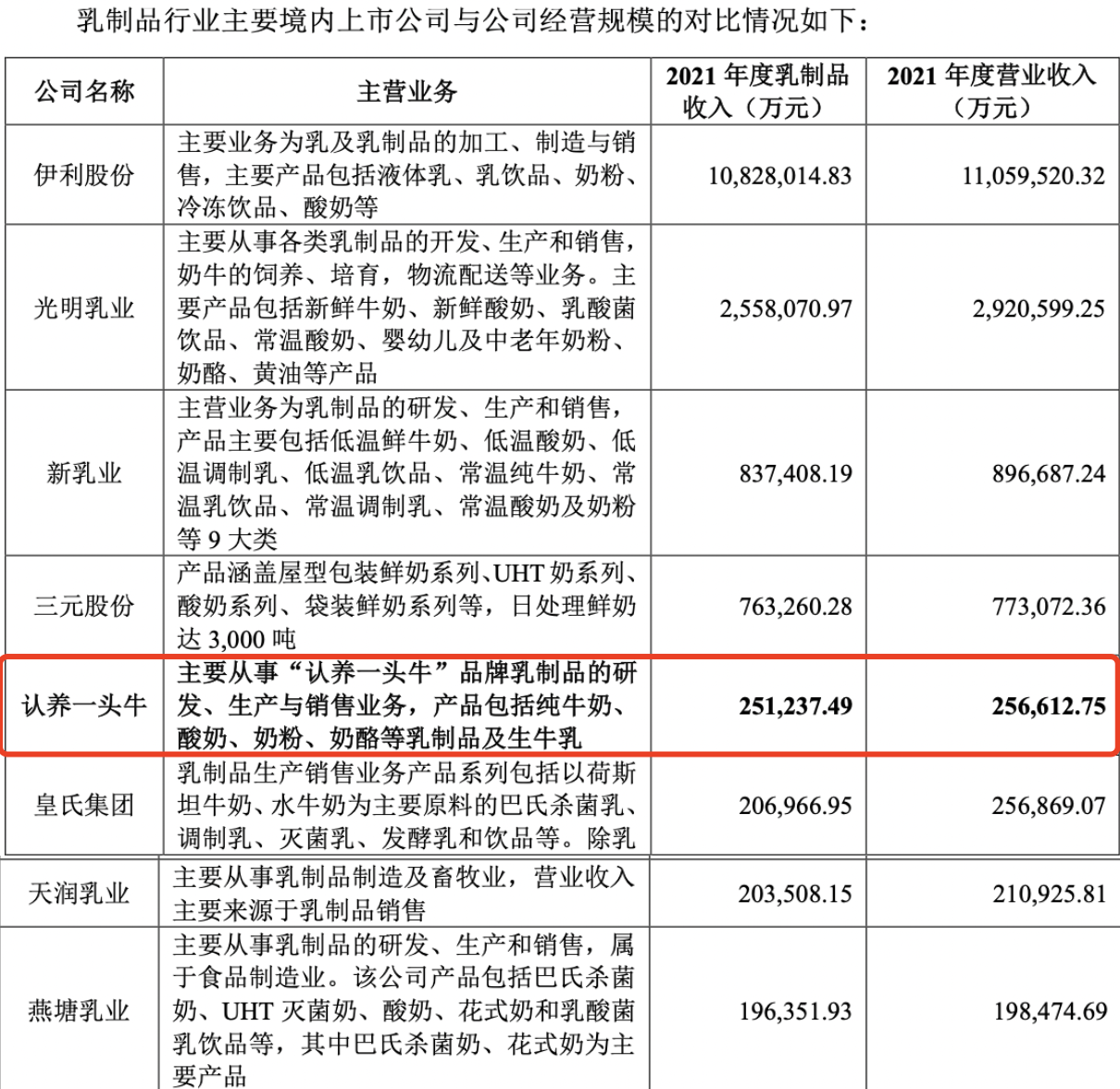 从营收规模上看,认养一头牛2021年的乳制品营收已经超过了皇氏集团(20.69亿元)、天润乳业(20.35亿元)、燕塘乳业(19.6亿元)等区域上市乳企,仅次于伊利、蒙牛、光明乳业、新乳业以及三元股份,排名第六大乳企。