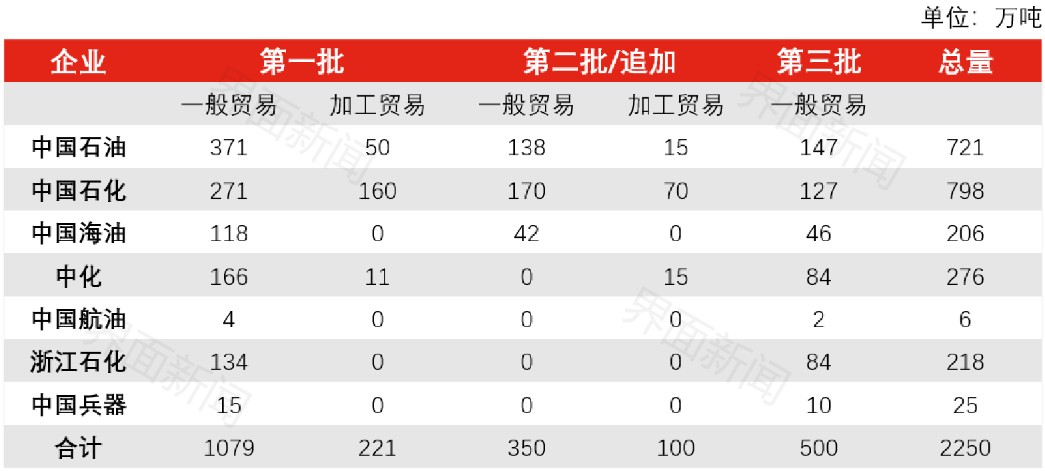 获得本次出口配额的企业包括“三桶油”、中国中化、中国航油、浙江石油化工有限公司(下称浙江石化)和中国兵器工业集团。