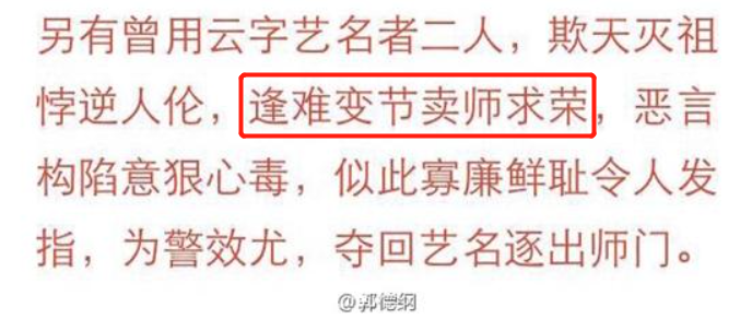 这也是为什么,郭德纲成名之初就敢为了徒弟大骂媒体,得罪了不少圈内圈外人。“尤其是一些无伤大雅的摩擦冲突,做师父的不护短,别人是要指着脊梁骨骂的。”