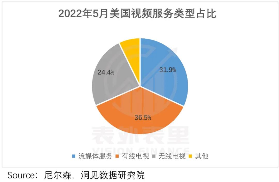 如下图,截止今年5月,美国境内视频服务的使用比例为:流媒体平台31.9%,有线付费电视36.5%,广播电视24.4%,其他7.2%。