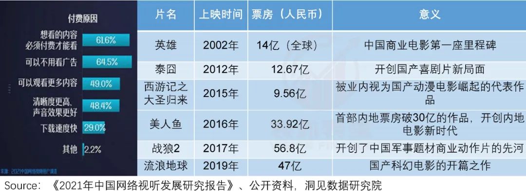 《2021年中国网络视听发展研究报告》显示,用户愿意为优质内容付费;而创新性的优质电影题材,屡屡刷新票房成绩,同样在印证这一点。