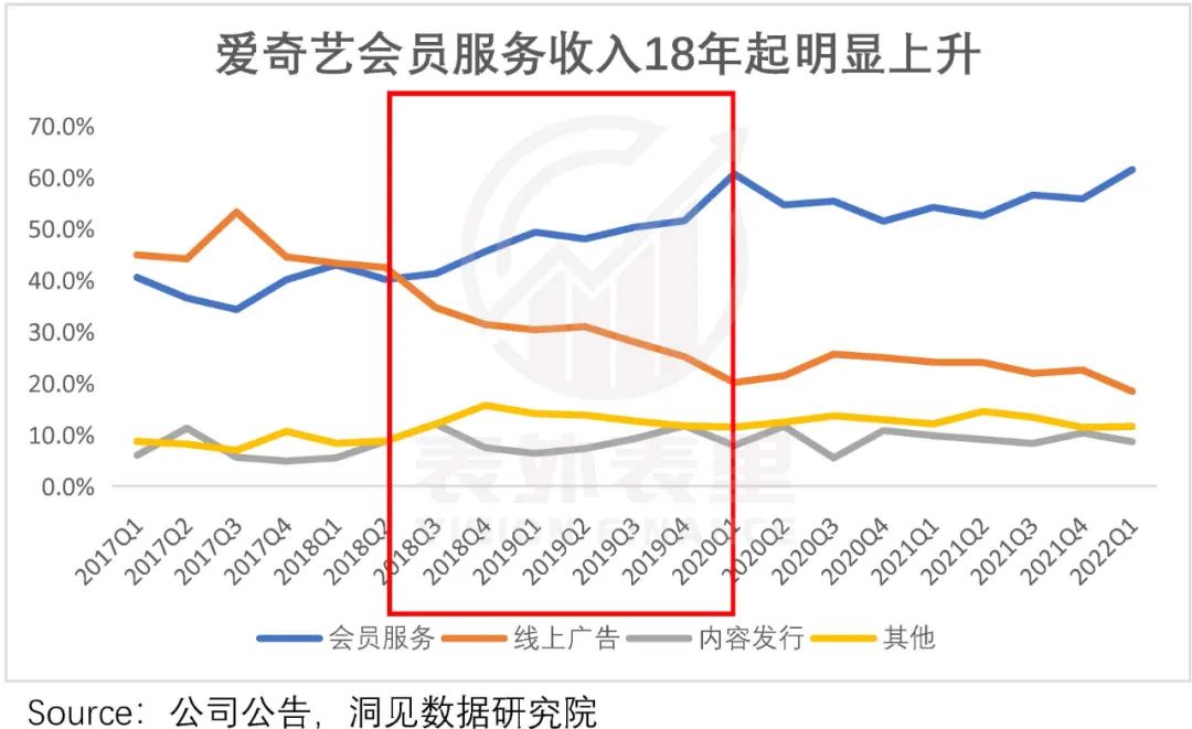 比如,2018起,爱奇艺内容战略上开始强调“精品化”,涌现出《大江大河》《都挺好》《无证之罪》等优质内容,相应地,其会员服务收入占比开始明显上升。