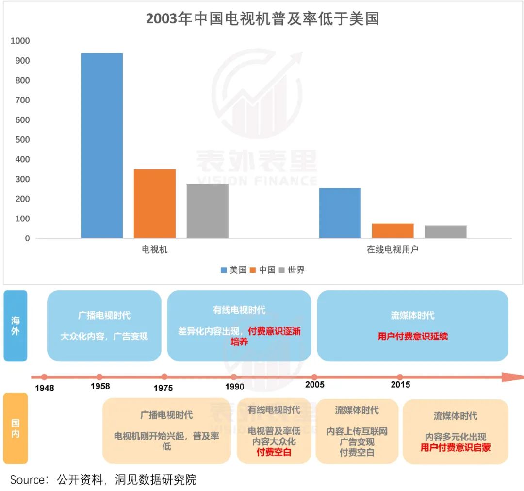 复盘可以发现,直到2003年,我国每千人拥有电视机数量,也只有美国的三分之一,有线电视的差距就更大了。