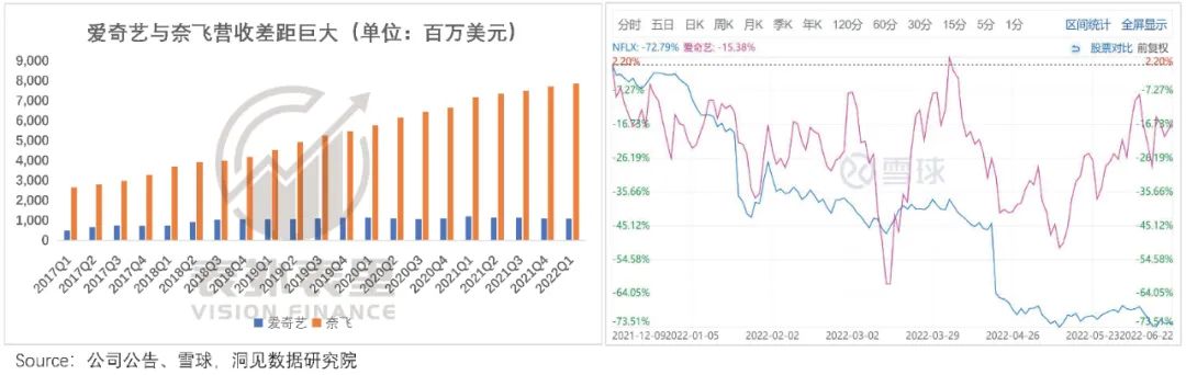 比如,爱奇艺无论在会员数、营收,还是净利润方面,都和奈飞有很大差距,但其今年上半年的股价,比奈飞稳定多了。