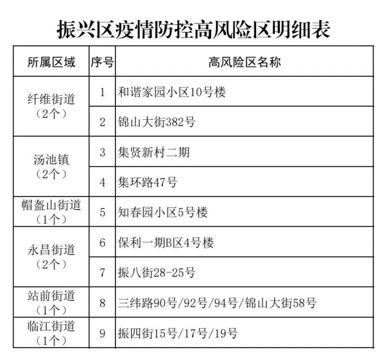 据“振兴新时代”微信公众号7月6日消息,按照《新型冠状病毒肺炎防控方案(第九版)》规定,经振兴区新冠肺炎疫情防控指挥部研究决定,对振兴区高风险区、中风险区、低风险区进行调整,确定高风险区9个,具体见《振兴区疫情防控高风险区明细表》;确定中风险区6个,具体见《振兴区疫情防控中风险区明细表》;高风险区及中风险区以外的其他区域为低风险区。
