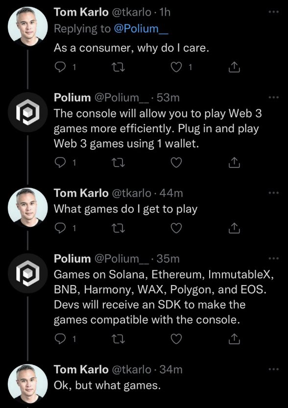 在这样的广泛共识下,研发“一款面向Web3游戏的游戏主机”显得非常没有必要,网上也因此流传着一组经典对话: