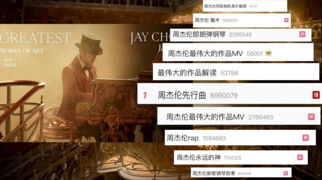 从发布到冲上热搜第一,周杰伦新专辑《最伟大的作品》首支MV只用了十分钟。微博话题显示,一个小时不到,113家媒体跟进了相关话题,话题阅读次数超过4亿次,随后“艺术大师”、“新出的MV是道美育题”等话题迅速承包了文娱榜单。