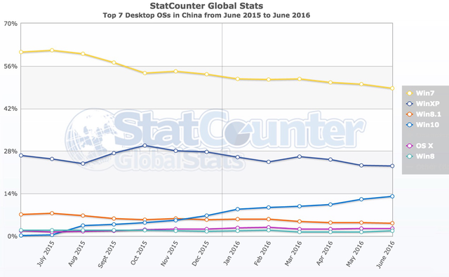 这是来自网络流量分析工具StatCounter统计的过去一年中国地区桌面操作系统份额变化图。