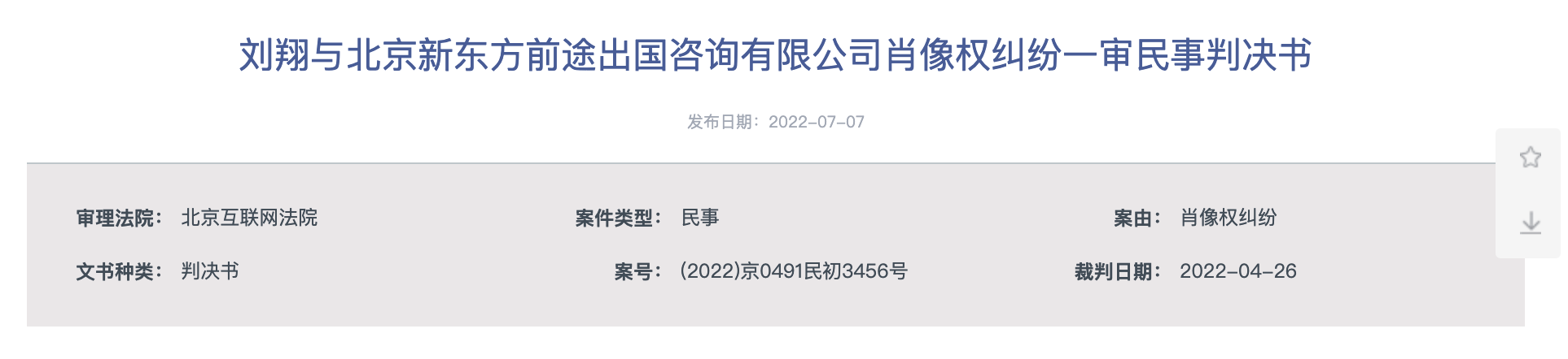 7月7日,北京法院审判信息网公开刘翔与北京新东方前途出国咨询有限公司肖像权纠纷一审民事判决书。审理法院为北京互联网法院。