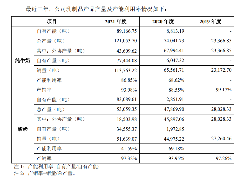 从生产来看,招股书显示,公司2019年全部的纯牛奶和酸奶都由外协生产。2020年,仍有90%以上的纯牛奶和95%以上的酸奶都由外协生产。