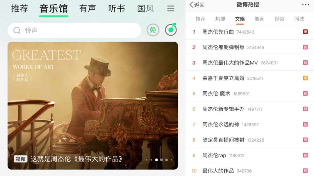 微博50个文娱热搜屠榜一半、B站最高超20万人同时在线、快手发布3小时播放量破亿、长时间稳坐抖音热榜头名、侵袭各大社交平台热搜榜…… 纵览华语乐坛,能因发布一首新歌MV引爆如此热度的就只有唯一的——周杰伦。