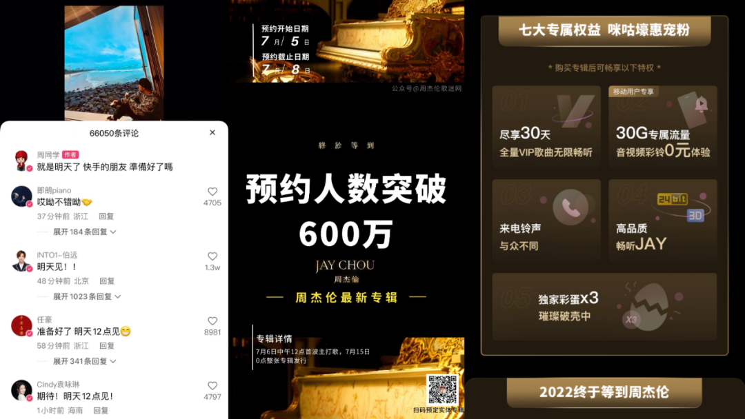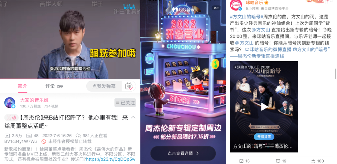 同为音乐平台的中国移动旗下咪咕音乐,自本世纪初“动感地带”时期就与杰伦强绑定。此番咪咕为周董发行数专之余还加码了系列宣发活动,如MV首发日当晚,咪咕音乐就联手方文山带来了《方文山的暗号》专场直播,文山畅聊创作经验的同时还释放了独家的“新专线索”,也是很差异化的平台打法了。