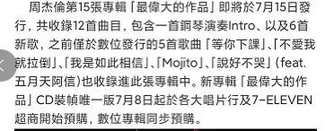 这里有一个最新的“意外情况”需要特别提出来,据中国台湾传来的711便利店新专预购信息透露,内含12首的《最伟大的作品》会收录进《不爱我就拉倒》等杰伦这些年已发行的5首“旧单曲”,这意味着新专里的“新歌”只余下1首“演奏曲”和6首“新单曲”(且包括已发布的《最伟大的作品》),这无疑会严重阻滞新数专的销量。