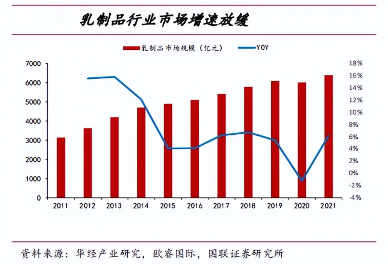 而且,随着乳制品行业增速逐渐放缓,据资料显示,目前乳制品行业正从增量转向存量竞争,我国乳制品行业2015年规模为4896亿元,行业增速见顶,之后增速逐年下滑,从量增驱动转向价增驱动。
