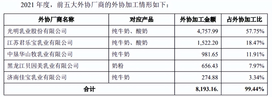 此外,认养一头牛的奶源并非全部都是“自有奶源”。招股书显示,光明乳业、君乐宝、中垦华山、贝因美、佳宝乳业等厂商均为其代加工厂。这也意味着,认养一头牛的部分产品为贴牌牛奶,独立生产能力并不突出。