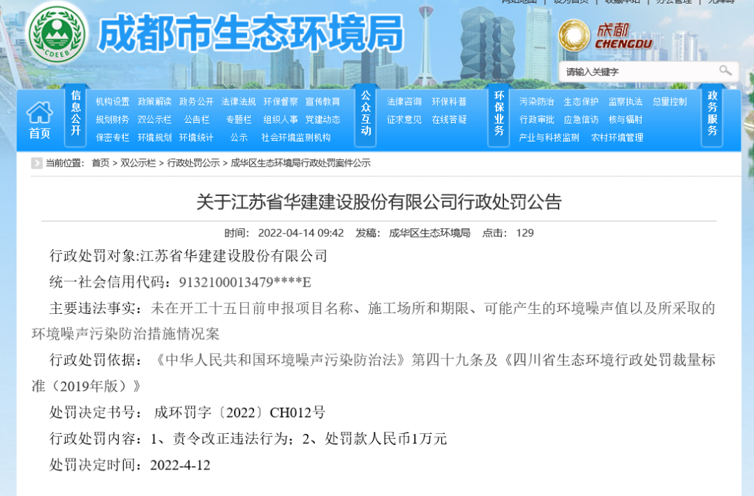 4月14日,成都市生态环境局发出一份《关于江苏省华建建设股份有限公司行政处罚公告》,公告指出,主要违法事实为未在开工十五日前申报项目名称、施工场所和期限、可能产生的环境噪声值以及所采取的环境噪声污染防治措施情况案,依据《中华人民共和国环境噪声污染防治法》第四十九条及《四川省生态环境行政处罚裁量标准(2019年版)》处以责令改正违法行为和处罚款人民币1万元的行政处罚。