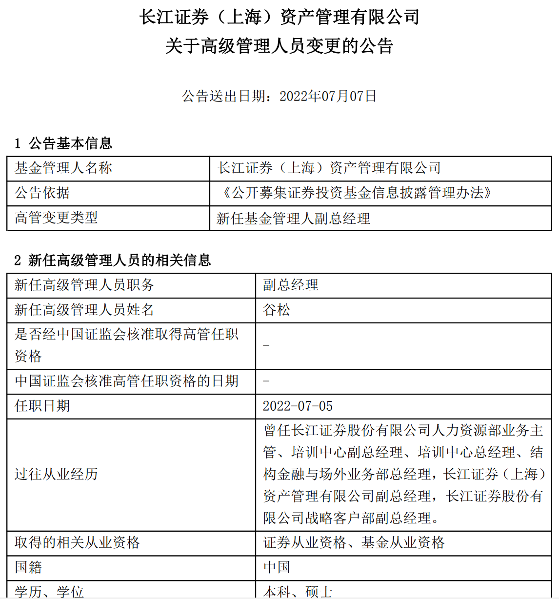 7月7日,长江资管发布公告,公司新任谷松为副总经理,任职日期2022年7月5日。