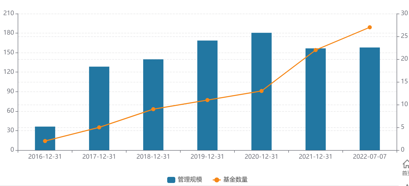 Wind资料显示,取得牌照后的前5年里,公募基金规模不断攀升,在2020年末达到180.54亿元的高峰。2021年一季度却又降至132.15亿元,最新管理规模为157.93亿元。