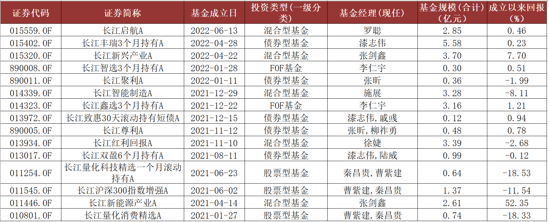 从基金成立时间来看,公司旗下新基、次新基较多。将A、B、C类份额合并计算,长江资管目前有27只公募基金,其中15只成立于2021年后。