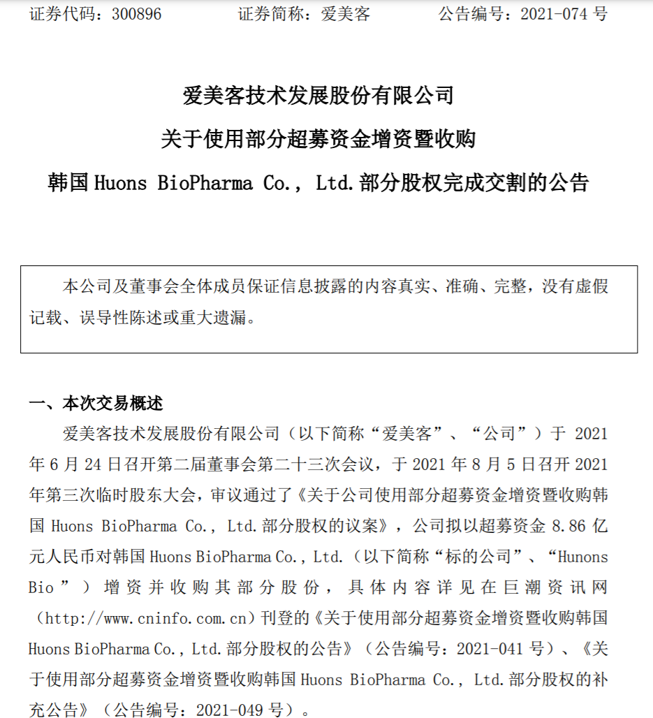 2021年6月,爱美客耗资8.78亿元完成对韩国Huons BioPharma(下文简称:HB)25%的股权收购,获得韩国HB生产的A型肉毒毒素产品中国区域的独家代理权。HB为韩国肉毒市场第四大参与者,2019年其肉毒素产品在韩国本地市场的份额为5%。