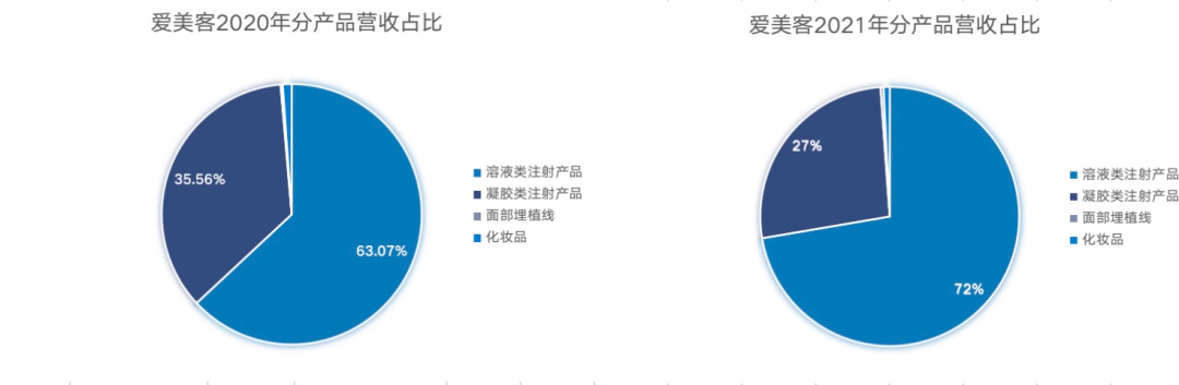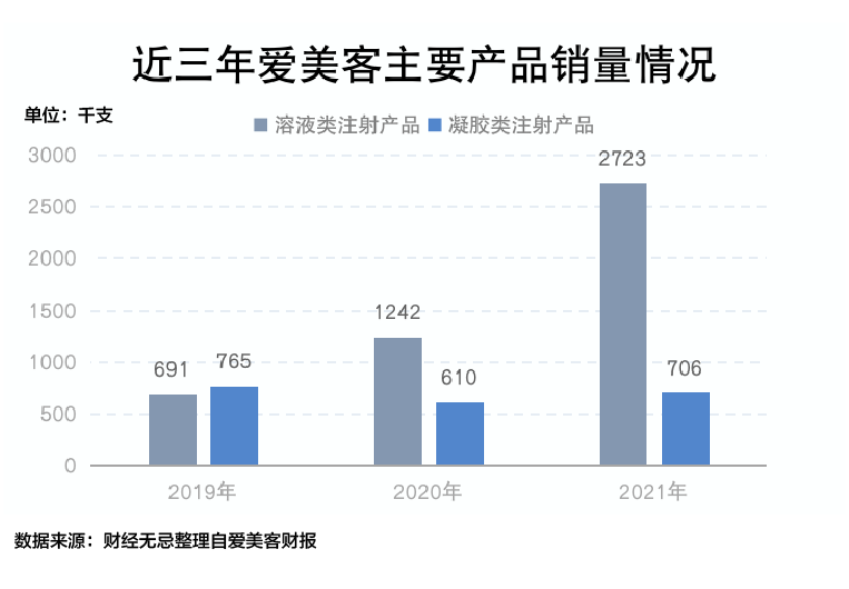 嗨体是一种用于修复颈纹的皮质填充剂,自2016年末拿到国家药监局批文后,于2017年1月正式上市,在2018年实现快速放量。财报显示,以嗨体为核心品类的溶液类产品在2021年卖了2723/千支,远远高于凝胶类与埋线类产品。