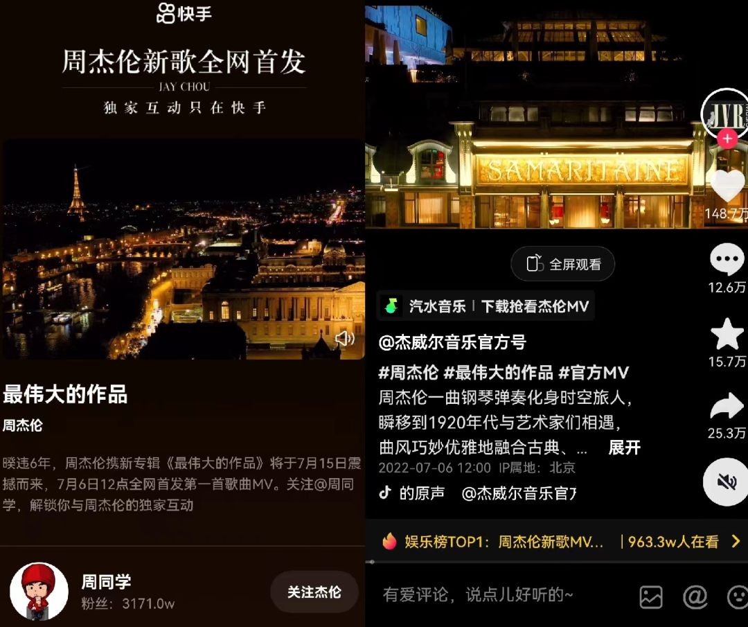 在B站宣传中,周杰伦新歌MV将在B站首发,但6日当天,包括腾讯音乐、腾讯新闻、视频号、抖音、今日头条、快手等多个平台都上线了这支MV,只是时间差了一点,而快手特地强调是“周杰伦本人在快手全网首发”,像抖音等没有版权的平台则是由杰威尔音乐的账号发布。