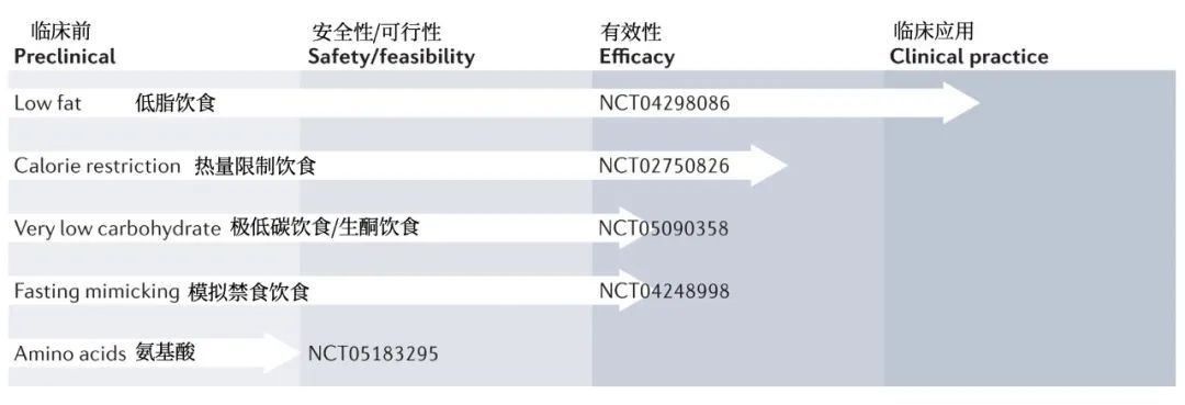 模拟禁食饮食是一种很有前途的临床干预措施,目前正处于临床试验阶段。绝大多数情况下,模拟禁食饮食对癌症患者安全可行,并且同时也观察到了胰岛素、IGF1和瘦素等一系列的有益变化。已有的数据显示,模拟禁食饮食能降低癌症患者的免疫抑制性细胞,增强肿瘤内的细胞毒性反应;此外,模拟禁食饮食与CDK4/6抑制剂联合使用是安全的,并可能提高疗效。