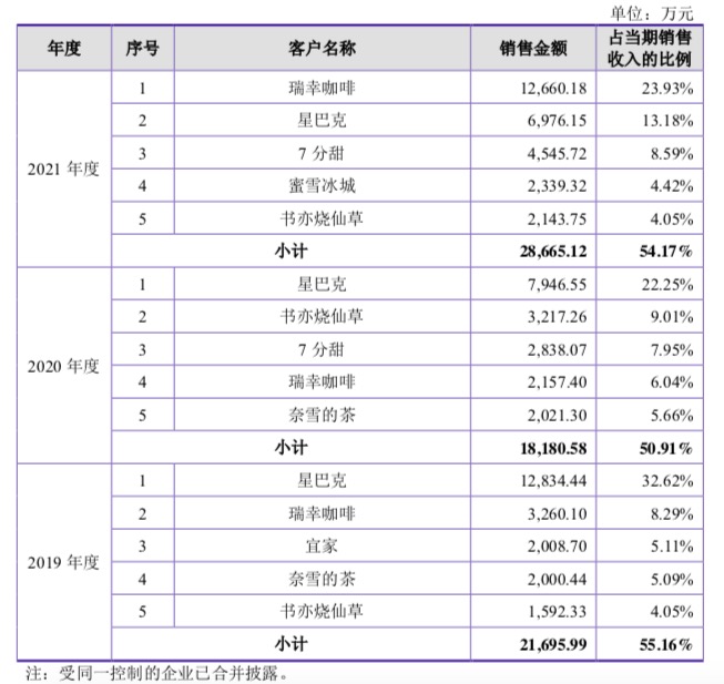 值得注意的是,在2019年时德馨食品的前5大客户还有一个是宜家,而到了2020年与2021年,前5大客户已经完全成为现制茶饮和咖啡企业,瑞幸咖啡也在2021年取代星巴克成为其第一大客户。