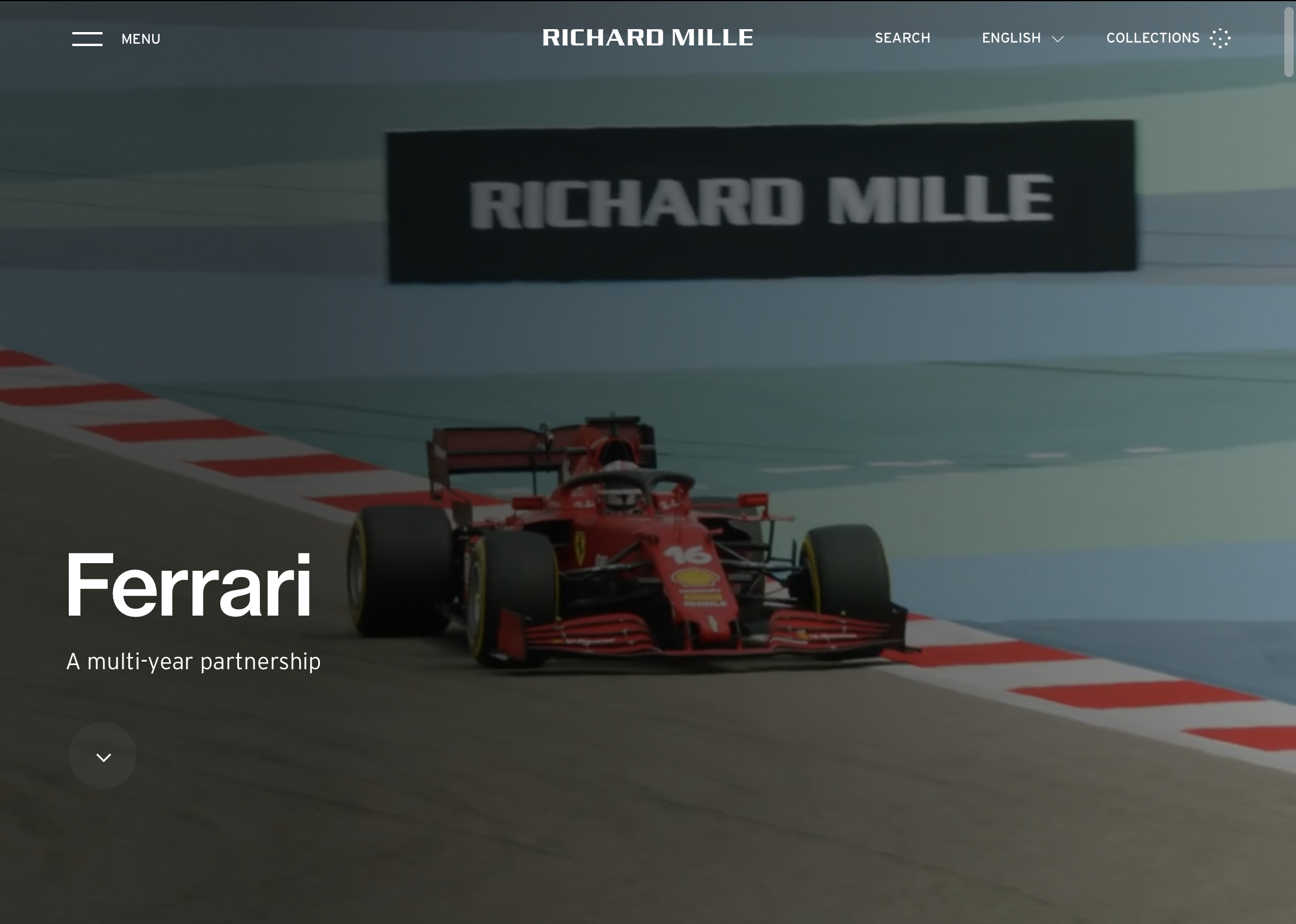 2021年,里查德·米尔宣布与法拉利达成多年合作协议,将赞助Formula 1(F1)方程式赛车、法拉利挑战赛、法拉利车手学院(Ferrari Driver Academy)等多项与法拉利赛车相关的顶级赛事和活动。不仅如此,里查德·米尔也透露,品牌瑞士工坊和法拉利设计部门将在未来几年携手,合作推出一系列腕表作品。