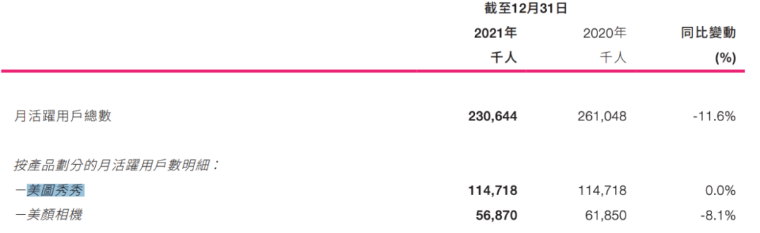 更重要的是,随着互联网的流量红利越来越小,美图想要留住用户也不容易。从美图业绩报告来看,主营软件美图秀秀2021年月活跃用户约1.15亿,与2020年持平,美颜相机月活跃用户5687万,同比减少8.1%。