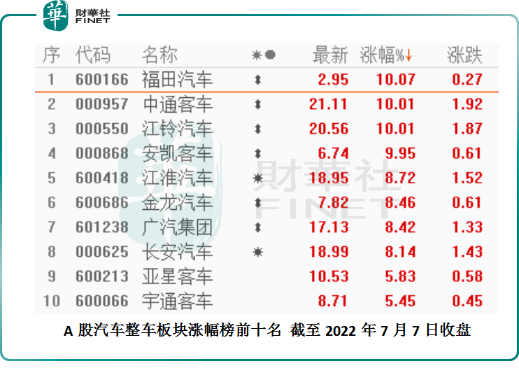 7月7日,A股早盘汽车整车板块全线拉升,截至收盘,江铃汽车(000550.SZ)、福田汽车(600166.SH)、安凯客车(000868.SH)、中通客车(000957.SZ)上演涨停好戏,江淮汽车(600418.SH)、金龙汽车(600686.SH)、广汽集团(601238.SH)、长安汽车(000625.SZ)等多只成分股涨幅超5%。