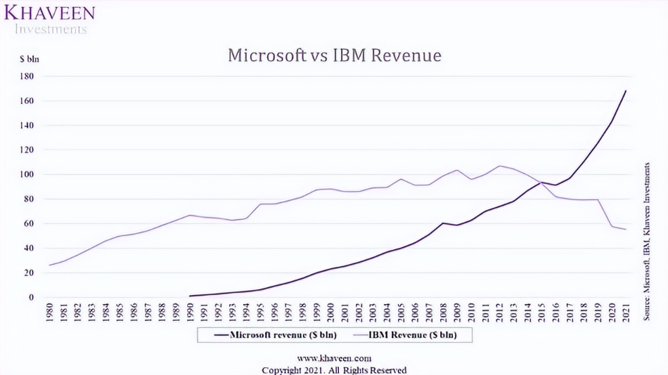 IBM和微软都是顶尖的 IT 公司。从 1970 年代到 2007 年,IBM 是收入最大的 IT 公司(72 亿美元),到2021 年甚至都没有进入前十名。相比之下,成立于 1975 年的微软继续成长为第二大 IT 公司2021 年的收入(1680 亿美元)仅次于苹果(3650 亿美元)。
