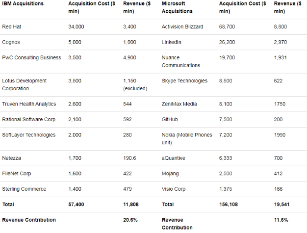 因此,尽管 IBM 剥离了 Lotus,但其最大一笔收购的收入贡献仍高于微软。此外,由于单位收购成本的收入较高,我们认为 IBM 拥有优于微软的收购战略。