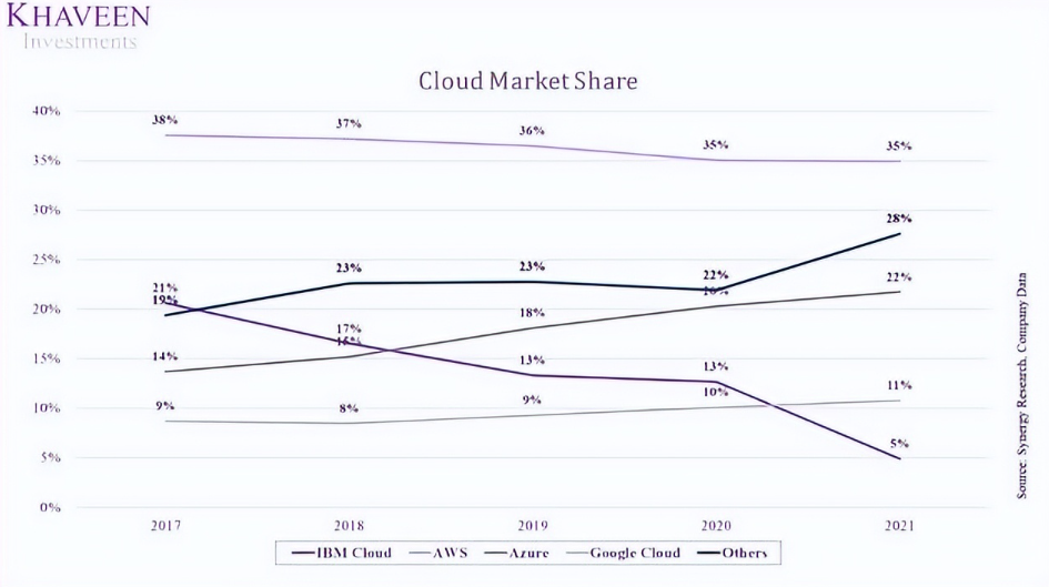 相比之下,IBM 的增长率在其竞争对手中最低,仅为 3.1%。正如我们之前的分析所强调的,IBM 在 2019 年收购 RedHat 后,剥离了其公共云业务(Kyndryl)并专注于其混合云业务。话虽如此,根据数据,我们认为微软加强了其在云市场的定位并且可以为其提供优于 IBM 的优势。