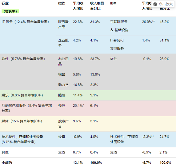此外,微软的 3 个部门(服务器产品、LinkedIn、Dynamics)总收入的 40% 的收入增长高于平均水平(13.1%),而 IBM 只有 2 个部门(互联网服务和基础设施以及 IT 咨询),总收入的 46%收入增长高于公司总平均水平(-5.7%)。