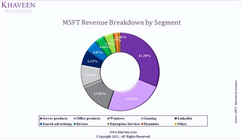 另一方面,微软从其最大的部门系统软件( 1986 年收入的 53%)转向应用软件,如生产力和人力资源软件。2021 年,Windows 仅占公司收入的 13%,5 年平均增长率低于 13.1% 的总平均增长率 5.8%。