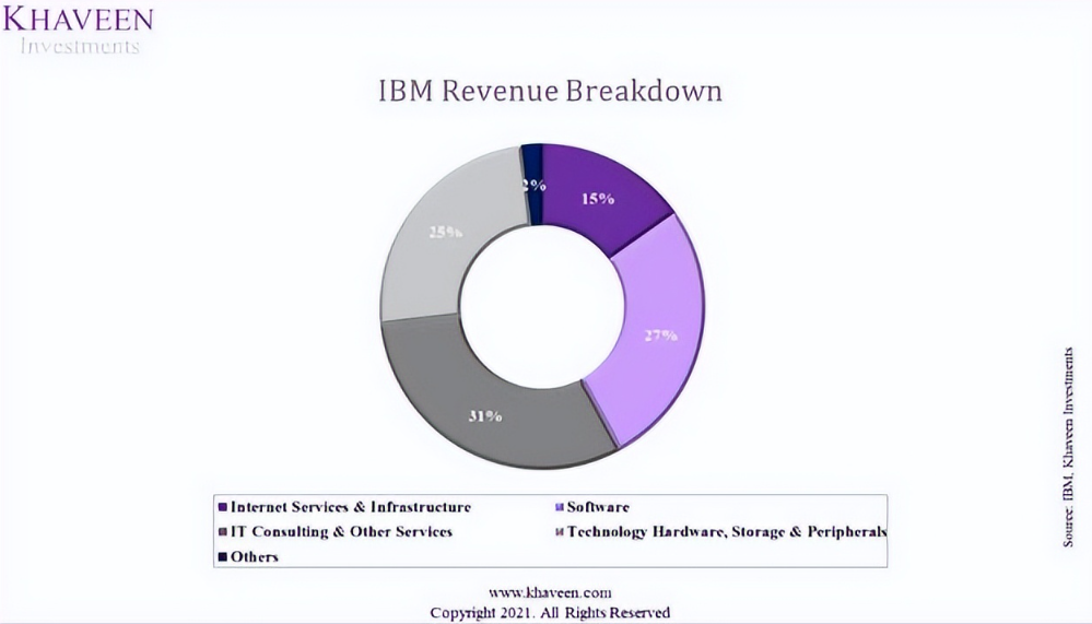 微软最大的部分是服务器产品(占收入的 31.3%),其次是 Office 产品(23.7%)和 Windows(13.8%)。相比之下,IBM 最大的部门收入贡献类似于 IT 咨询(占收入的 31%),其次是软件(27%)。