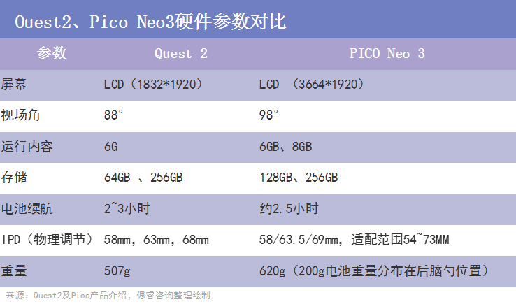 先看硬件参数,以Oculus Quest 2和Pico Neo 3为例: