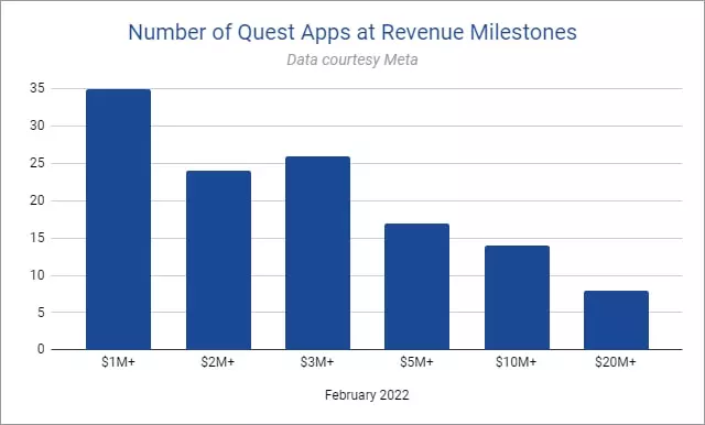 今年的GDC大会上,Meta内容生态总监Chris Pruett表示,截止2022年2月,Quest平台上,有8个应用程序的收入超过了2000万美元,124个应用软件获得了100万美元以上收入。