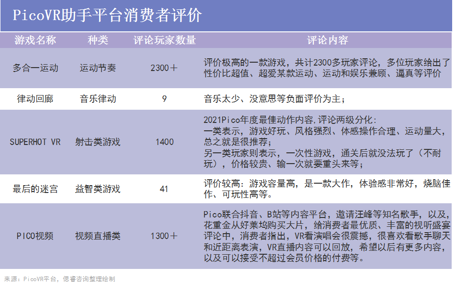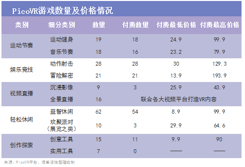 经偲睿咨询调查,截止目前,PicoVR助手中各类内容共计205项,其中游戏148款(运动节奏、娱乐竞技以及益智休闲)。而有媒体统计,截止4月底Quest平台共计357款软件,并且打造了《节奏光剑》《半衰期:爱莉克斯》等标杆性内容。在内容数量和质量上看,目前Pico不敌Oculus。
