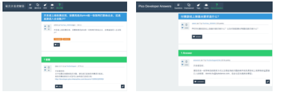 最后,打开Pico游戏开发者社团,我们发现,在面对一部分有兴趣在Pico生态开发游戏的创作者时,官方的回复信息含量有限,要么回复的链接无法打开,要么给出一个邮箱,需要进一步费时费力的沟通。此种状况,对于游戏开发,以及形成开发商在Pico平台积极开发的氛围并无利处。